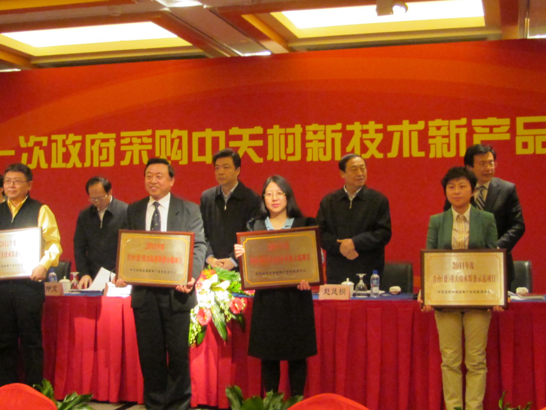 2012年第一次政府采購中關(guān)村新技術(shù)新產(chǎn)品簽約大會于2012年2月17日在北京國際飯店會議中心舉行。愛生科技張瓊總經(jīng)理接受北京市委常委趙鳳桐頒獎。本次會議由市委副秘書長傅華主持,市委常委、常務(wù)副市長吉林參會并講話,市委常委趙鳳桐,副市長茍仲文,中關(guān)村管委會黨組副書記、主任郭洪,市有關(guān)部門、各區(qū)縣政府領(lǐng)導(dǎo),簽約項目雙方代表,市屬企業(yè)代表,園區(qū)企業(yè)代表和首臺(套)企業(yè)代表近200人出席會議。